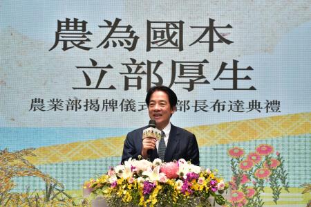 賴副總統今日出席農業部揭牌儀式表示,1984年農委會成立,而1988年的520農民運動的七大訴求之一,就是成立農業部,很榮幸見證歷史性的時刻,他要代表蔡感謝幫助農委會升格農業部的每一個人,期許陳部長任重道遠,他特別代表蔡英文總統帶來三句話,希望農業部同仁作為座右銘,第一句是農業部要永遠做農漁民的靠山,持續不斷解決農民的問題,積極提升農民收入,以身為農民為榮;第二句是農為國本,農業部要積極讓農業永續發展,持續運用科技新創等手段提升農業競爭力,面臨氣候變遷和數位轉型,農業部和農漁民站在一起,才能共同面對挑戰;第三句是立部厚生,農業部存在目的是要滿足兩千三百五十萬的國人生活糧食所需,面對氣候變遷,未雨綢繆因應未來糧食危機及早準備,這是農業部不可迴避的責任,期待農業部讓臺灣農業永續發展,農漁民生活更好,糧食安全不會出現危機。