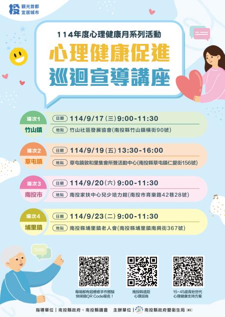 一、為響應9月10日「世界自殺防治日」與10月10日「世界心理健康日」,本府衛生局規劃辦理旨揭活動,並以「聊療心.心投愛」為主題,透過系列講座及社區宣導,推廣心理健康知能,促進民眾對心理健康的重視。只要民眾參與旨揭活動並拍照上傳南投縣政府衛生局粉絲專頁,即有機會獲得500元商品卡。