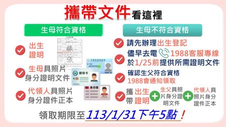 財政部國庫署進一步提醒,新生兒領取普發現金期限將於113年1月31日屆期,倘民眾遇有無法領取情形,或遇生母不符合領取資格,或部分案件因故須後送相關機關確認領取資格,請務必儘早撥打1988客服專線,並於113年1月25日(星期四)1988客服專線服務時間(上午8時30分至下午6時30分)完成提供相關證明文件(即上傳證明文件);倘超過113年1月25日下午6時30分仍未補件,因後送及資料傳遞至系統平台均需作業時間,同時預留民眾至郵局領取時間,而郵局臨櫃領取普發現金僅提供服務至113年1月31日下午5時,民眾若未依所定時間提供所需文件,恐無法領取。