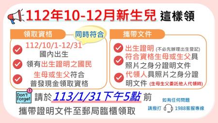 財政部國庫署表示,依全民共享經濟成果普發現金辦法第3條第2項及第4條第2項規定,112年10月1日至12月31日間在國內出生並領有出生證明之國民,且其生母或生父符合領取資格之新生兒,應於113年1月31日前,備妥出生證明及其生母或生父之身分證明文件,至郵局臨櫃領取。