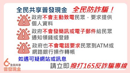 財政部國庫署再次強調,政府不會發簡訊或電子郵件通知領錢或登錄,也不會電話要求到ATM或網路銀行操作轉帳,請民眾務必提高警覺,千萬不要上當,以免個資被竊或遭詐騙。如遇可疑網站或訊息,立即撥打165反詐騙專線,全民共同防堵詐騙事件。