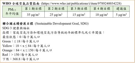 國衛院透過環境部的空氣品質監測資料,結合衛生福利部的健保資料庫、美兆健康資料庫與內政部死亡統計資料等本土數據,分析多種空氣污染物暴露與死亡及疾病增加風險,建立了專屬臺灣的空氣品質健康指標。考量心血管疾病的減量健康成本效益分析,若PM2.5年平均濃度調降至12.5μg/m3,則減量成本的最大效益可與PM2.5可歸因心肺代謝疾病的疾病損失年(years lived with disability,YLD)達到權衡。根據聯合國永續發展目標(Sustainable Development Goal,SDG)的目標三-健康與福祉之指標,我國PM2.5年平均若控制到12.1μg/m3,則可歸因死亡率即達到的green程度(即年齡標準化可歸因死亡率≤18/十萬人)。上述的研究成果提供我國空氣品質標準(如PM2.5及NO2)下修的重要依據。