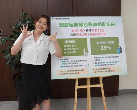環境部(前環保署)於111年公告「非填充食品之塑膠再生商品推動作業要點」,鼓勵企業使用再生料,本次針對公告應回收項目之塑膠容器類產品,祭出綠色費率優惠,如自願性使用再生料達25%,提供回收清除處理費徵收費率最高85折優惠,希望藉由實質鼓勵,推動業者從源頭設計即導入資源循環概念,帶動永續生產模式,進而邁向聯合國永續發展目標SDGs 12「促進綠色經濟,確保永續消費及生產模式」,預計再生料於2025年使用量增加2.4萬噸,減碳量可達4.8萬公噸。