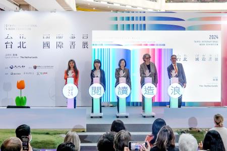 文化部主辦、台北書展基金會承辦的2024年第32屆台北國際書展,2月20日至25日於世貿一館展開為期6天出版閱讀嘉年華會。今(20)日書展開幕首日,總統蔡英文、文化部政務次長李靜慧、台北書展基金會董事長吳韻儀、荷蘭在台辦事處代表譚敬南(Guido Tielman)、荷蘭教育文化及科學部文化與媒體司副司長馬泰森、主題國策展單位MVRDV代表Jacob van Rijs、Jan Knikker,以及各國駐臺大使、國內外重要出版人士等共同出席開展。