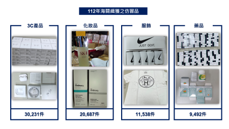 關務署說明,海關近年緝獲之仿冒品多以快遞方式進口,依據該署統計,112年於海、空運快遞貨物專區緝獲之侵權案件共292案,占全年度案件量之89.5%,而緝獲仿冒商品類別則以3C產品、化妝品、服飾及藥品為大宗,多為日常生活使用商品,此類仿冒品倘流入國內市場,不僅損害消費者權益及健康,影響合法廠商經營成果,亦破壞我國際形象。