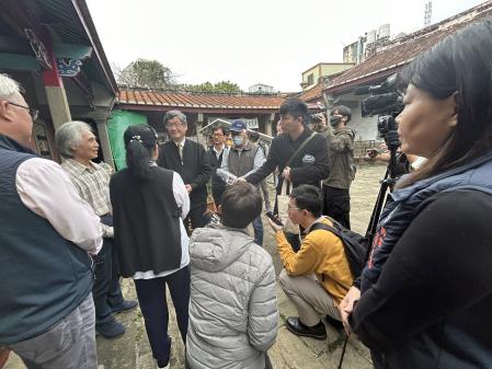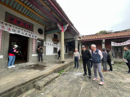 客家委員會主任委員楊長鎮6日在新竹縣北埔鄉長莊明增陪同下,前往關心北埔新姜天水堂古蹟一案與現勘北埔招牌及街區改造階段性執行成果,除了表達支持將新姜天水堂納為古蹟,也再次強調客委會會全力支持補助新姜天水堂的修繕經費,盼透過中央與地方政府的協助,為北埔的發展留下完整的歷史,也帶動客庄在地經濟及觀光發展。