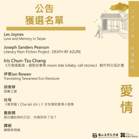 2023年徵選「愛情主題」;或「非愛情主題,但已有接近完成之創作」者,獲選者及寫作計畫(依姓氏筆劃排列)為:Les Joynes”Love and Memory in Taipei”、Joseph Sanders Pearson”Literary Non-Fiction Project:DEATH BY AZURE”、Iris Chun-Tzu Chang「《月潮搖籃曲:細胞故事集moon tide lullaby: cell stories》創作與出版計畫」、伊恩Ian Rowen”Translating Taiwanese Eco-literature”、邱常婷「困難之愛」、玖芎「《查某膣(Cha-bó͘ chi)》女性情慾愛情小說集」、詹斯閔「被白蟻吃掉的日記,你寫回來了沒?」、譚劍「蝴蝶與飛蛾」。