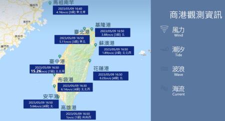 海氣象資訊包含風力(風速、風向)、波浪(波高、週期及波向)、潮位及海流(流速及流向) ;9個商港包括基隆港、臺北港、蘇澳港、花蓮港、臺中港、布袋港、安平港、高雄港及馬祖福澳港。