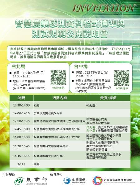 「智慧農業感測資料格式標準與測試規範」公開說明會報名連結如下,活動免費,名額有限,歡迎各界踴躍報名: