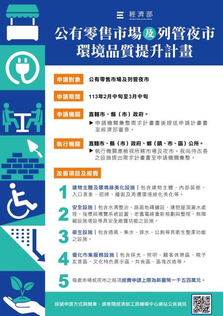 「逛菜市仔、踅夜市」是國人日常生活重要一環,因此行政院於112年12月29日核定經濟部提報「公有零售市場及列管夜市環境品質提升計畫」,爭取3億元經費,優化市場或夜市環境品質並更新再造,以帶動消費人潮回流,讓具在地特色的美食名攤好味道,持續受到消費者的青睞。