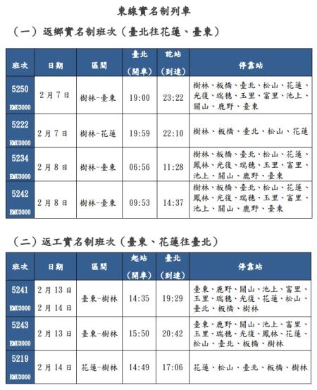 另113年2月7、8及113年2月13、14日東線8班實名制列車(如附表),將於113年1月11日(星期四)零時起開放111年8月1日前設籍於花蓮縣、臺東縣之現住人口與國民身分證統一編號第1碼為U或V及上開兩者之配偶與直系血親1親等國民訂票。