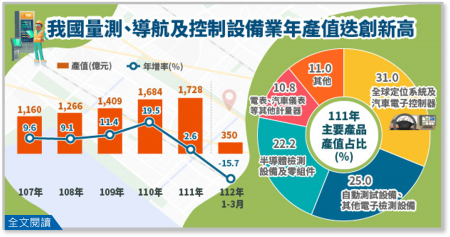 1.111年量測、導航及控制設備業產值達1,728億元,創歷史新高:我國量測、導航及控制設備業主要包含衛星導航系統、雷達系統、計量器、半導體檢測設備、電子量測儀器、其他精密及科學量測儀器等產品之製造。近年因美中貿易戰,以及政府推動臺商回臺投資方案,促使廠商陸續移轉生產重心,擴增國內生產比重,加上COVID-19疫情催動廠商加速布建設備自動化,推升我國量測、導航及控制設備業111年產值達1,728億元,連續第5年創歷史新高,年增2.6%,連續7年呈正成長,惟112年受全球經濟成長趨緩,終端產品需求疲軟,業者投資意願下滑等影響,致第1季產值下滑15.7%。