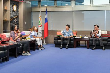 今天來訪的還有臺東縣體育支架大洋舟委員會江伊茉 Yvonne Jiann副主委與夏威夷原住民學校卡美哈美哈學校駐臺代表洪慧芬 Helen Scott女士,一同探討太平洋藝術節、全國原住民族運動會與夏威夷原住民學校等議題,並期待未來能夠在海洋文化與原住民族教育能有更多的交流、學習。