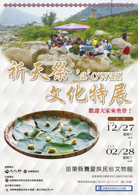 祈天祭(’a’owaz)是賽夏族的重要祭儀之一,族人於每年農曆三月向天神 koko' wa:on 祈求風調雨順、農作豐收。早期祭儀包含祈晴、祈雨、祈鎮風與祈驅疫,後因時代變遷整合為今日的祈天祭。展覽以影像、文物、多媒體與田野調查資料呈現祭儀的歷史脈絡、信仰內容與文化內涵,帶領觀眾認識賽夏族對自然環境的尊重、對歲時節令的理解,以及祭儀在族群文化中所具有的核心地位。