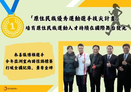原民會透過「原住民族優秀運動選手拔尖計畫」,提供張博雅選手及教練訓練與參賽經費,支持選手在追逐夢想的道路上持續精進。未來,也將持續推動「原住民族運動人才培育方案」,陪伴更多原住民族運動員站上世界舞台,為臺灣爭取更多榮耀。