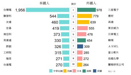 智慧局公布112年專利申請及公告發證統計排序,在發明、新型、設計三種專利申請方面,本國人由台積電以1,956件八連冠,外國人由南韓三星電子以978件首次榮登榜首,雙雙打破歷年最高紀錄;三種專利獲證方面,由台積電1,040件及美國應材591件分居本國人及外國人之首。