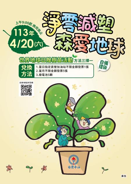 響應世界地球日,台灣中油公司將在4月20日(六) 上午9時起在全台100處直營加油站舉辦「淨零減塑 森愛地球」贈樹苗活動,民眾可持發票或回收廢電池至加油站兌換樹苗,留給下一代永續美好的環境。
