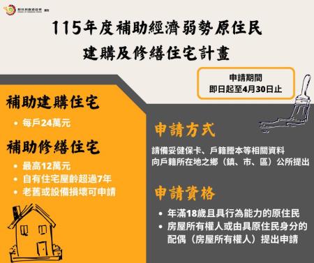 115年度補助經濟弱勢原住民建購及修繕住宅開始受理