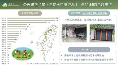 近年露營活動盛行,依據交通部觀光署資料,全臺目前總計約1,780處露營場,環境部為避免露營產生的污水,直接排放污染水體,於16日修正公告「禁止足使水污染行為」,規範水污染管制區內露營場,應收集污水,並設置污水處理設施處理,處理後排放水質應符合放流水標準。考量業者改善設施需要,將公告定於114年3月1日起施行,有一年緩衝期,可利業者妥為因應。
