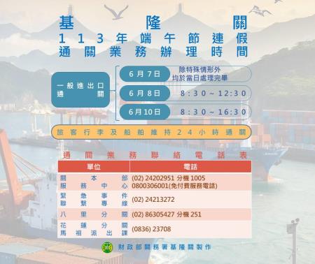 基隆關表示,為維持進出口通關順暢,端午節連續假期前一天(113年6月7日)及連假期間(6月8日至10日)仍派員辦理通關業務,並免徵收特別驗貨費及特別監視費。