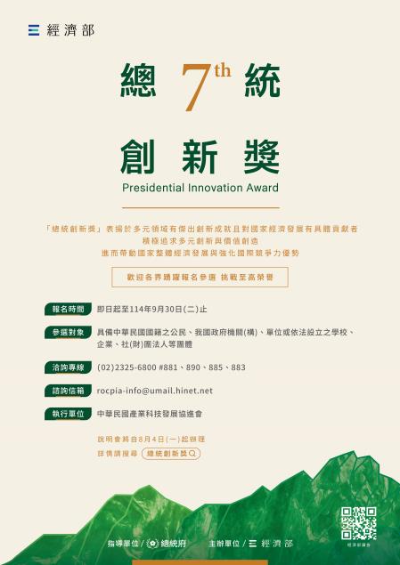 二、檢附「總統創新獎」參選須知,敬請貴單位協助於所屬網站放置第七屆「總統創新獎」訊息,並惠予協助公告與轉知,相關參選資訊請至「總統創新獎」網站查詢(https://service.moea.gov.tw/EE514/tw/rocpia/)。