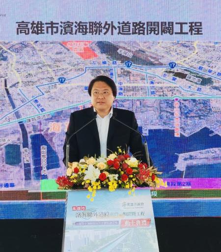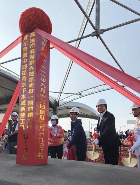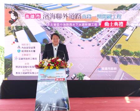 內政部長林右昌13日參加「高雄市濱海聯外道路南段一期開闢工程暨左營區中海路雨水下水道新建工程」動土典禮。林右昌表示,高雄市區濱海聯外道路全長約7.3公里,包含雨水下水道工程,中央補助逾22.5億元。這次辦理動土的是濱海聯外道路南段一期開闢工程與左營區中海路雨水下水道新建工程,總工程費9億4,753萬元,內政部補助近7億元,預計115年6月完工,可期完善在地南北路網及促進整體經濟發展。