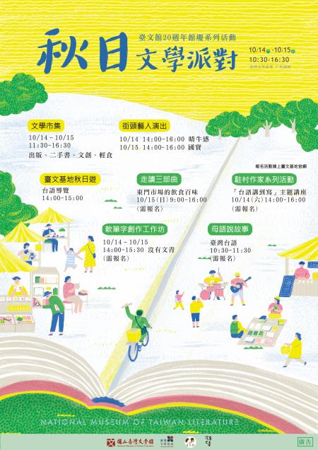 國立臺灣文學館20歲了!10月17日「臺灣文化日」是臺文館的生日,臺文館及位於臺北的臺灣文學基地,於館慶前夕的週末,南、北攜手分別推出「文學暢秋日」及「秋日文學派對」館慶系列活動。