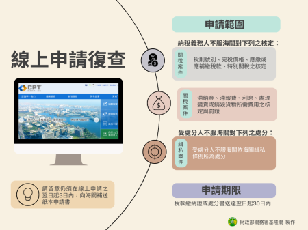 基隆關表示,依關稅法第45條、第95條及海關緝私條例第47條規定,納稅義務人及受處分人如不服海關對其所為之處分,得於收到稅款繳納證或處分書之翌日起30日內向海關申請復查。為免因逾期申請而不符復查程序,海關新增線上復查申請服務,即時受理申請。