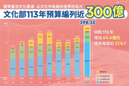 行政院會24日通過113年度中央政府總預算,文化部主管預算獲編268.66億元,較112年法定預算204.26億元,增加64.4億元,成長幅度近32%,加計前瞻預算29.59億元,總計113年預算達298.25億元。文化部長史哲表示,113年度國家整體總預算增加,文化部預算也沒有落單,感謝總統蔡英文、行政院及院長陳建仁、副院長鄭文燦以最大的幅度支持文化部所提各項文化政策,文化部也將用最大的努力與朝野委員溝通獲得立法院支持,更將以嚴謹的施政回應各界期待。