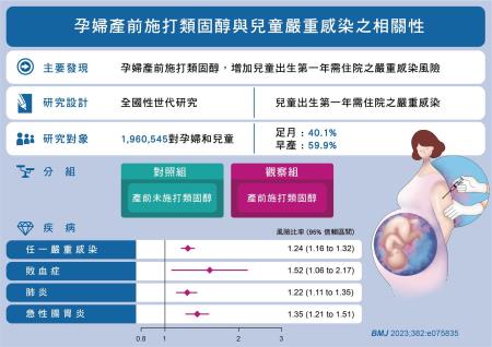研究團隊利用世代研究法(cohort method)分析衛生福利部資料科學加值中心的巨量健康資料,探討婦女在懷孕期間施打類固醇與其子女出生第一年內產生嚴重感染之間的關聯性。在2008年至2019年間共約196萬對母嬰中,有約4萬5千位孕婦曾於孕期施打類固醇。研究結果顯示,孕婦在產前施打類固醇,嬰兒出生第一年內產生任一嚴重感染的風險較未施打類固醇者高出1.24倍;分析特定感染症發現敗血症高出1.52倍、肺炎高出1.22倍和急性腸胃炎高出1.35倍。進一步分析發現,產前施打類固醇對早產兒與足月兒都有增加嚴重感染的風險。