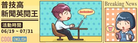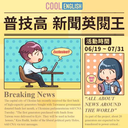為加強普技高學生的英文口説能力,教育部國民及學前教育署委由國立臺灣師範大學辦理「Cool English普技高新聞英閱王活動」,鼓勵學生透過酷英網練習日常對話,強化英語口說能力。112年度活動報名時間自6月19日起至7月31日下午5點止,相關報名資訊可至「Cool English酷英網英語線上學習平臺」(https://www.coolenglish.edu.tw)查詢。