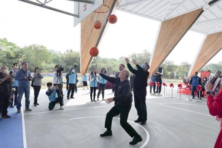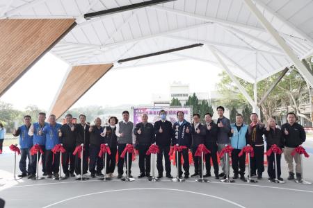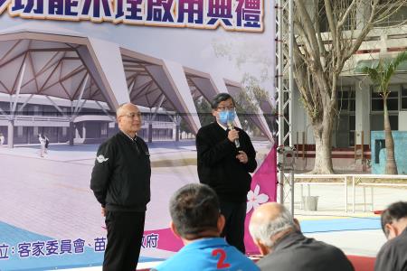 持金剪一刀落下紅緞帶,客家委員會主任委員楊長鎮9日前往苗栗縣造橋鄉出席「社區多功能禾埕」啟用典禮。楊主委表示,客委會的禾埕計畫主要是增設客庄良好的公共空間,讓鄉親互相交流、聯繫情感,希望新的禾埕啟用後,大家能多帶孩子來打球、打嘴鼓,共同營造一個健康的活動場域。