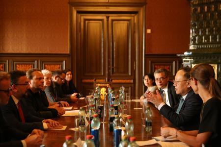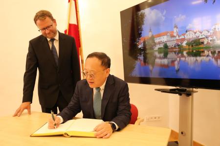 史哲昨日一早6點多抵達捷克,完全未有任何休息或停留,就立刻展開密集行程。捷克參議長韋德齊特別邀請史哲到訪他的家鄉,也是捷克列為世界文化遺產的特爾奇市(Telč),除參訪當地重要古蹟及文化景觀,並就兩國的文化資產保存與再利用、文化資產與居民共存共處等議題交換意見。對於史哲提到,因為臺灣非聯合國會員國,以致於在申請世界文化遺產擁有許多阻礙。韋德齊回應,「雖然未來還有一段路要努力,但我們會持續關注這個議題」。