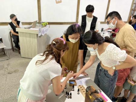 8月27日下午的「療癒好聞香」由專業芳療師曾淑芳擔任工作坊講師,曾老師精心布置讓整個會場充滿芳香氣息,活動一開始先讓學員以石膏及顏料調製擴香石,曾老師以流利台語講解九種精油的特性與氣味,讓民眾了解各項精油的用途,並發送九種精油試紙讓學員聞香,同時選擇自己的香氛組和,最後將擴香石脫模並滴上專屬的精油,完成獨一無二的擴香石DIY。最後曾老師邀請三位學員以台語分享心得,學員都表示非常喜愛這次的台語推廣活動。這天透過台語結合芳療,讓學員沉浸在滿滿的香氣與台語氛圍中,身心得到舒緩也同時自然的使用台語交流。