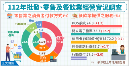二、疫情催化與政策推動雙重效應下,零售業行動支付使用意願持續攀升:111年受到疫情影響,民眾為降低接觸傳染風險並維持安全社交距離,行動支付比率提高至9.3%,較110年增加2.5個百分點。
