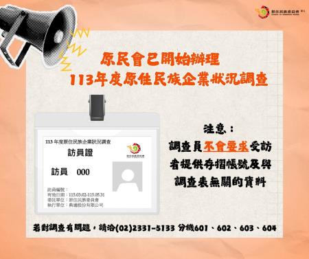為瞭解原住民族企業的經營現況與發展需求,作為未來政策規劃與資源的重要參考,原民會辦理113年度原住民族企業狀況調查。