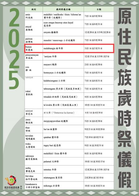 小提醒:布農族歲時祭儀放假日期間為3月1日至5月31日,可擇一日放假參與唷!