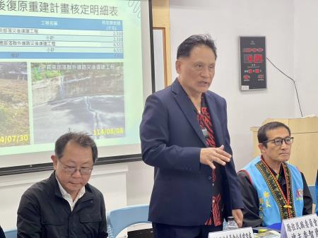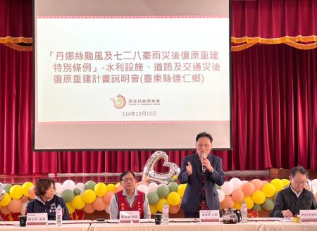 主任委員於說明會中表示,今(114)年7、8月間丹娜絲颱風、七二八豪雨及楊柳颱風對南臺灣造成重大災情,原住民族委員會編列災後復原重建經費45.53億元,其中補助部落災後復原重建工程41.38億元,已核定179件、38.2億元經費,辦理部落排水、邊坡復建,以及聯絡道路、橋梁與部落基礎復建。
