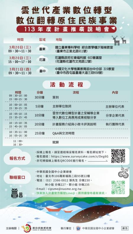 原住民族委員會為協助原住民族小微企業因應數位時代的挑戰,定於113年3月20日至3月21日止,於臺東、花蓮及臺中等地辦理113年度「雲世代產業數位轉型-數位翻轉原住民族事業」計畫申請說明會,歡迎有志投入數位轉型之原住民族小微企業(員工人數9人以下)負責人及聯合型提案單位(即公協會、法人組織、國內大專院校或資訊服務廠商)踴躍參加,倘不克實地參加亦可線上參與,以掌握數位轉型契機,共創原住民族產業永續發展。