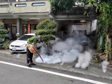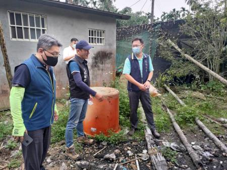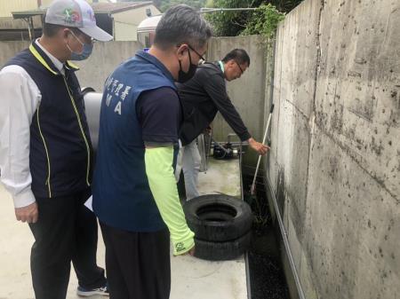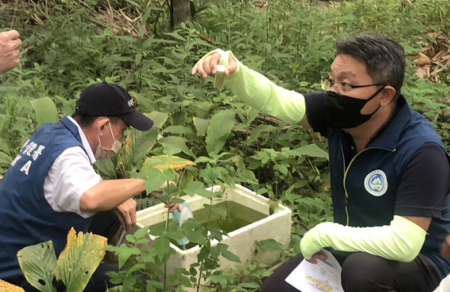 因應嘉義縣登革熱疫情升溫,梅山鄉確診人數突增,環境部環境管理署(下稱環管署)南區環境管理中心石秉鑫主任19日會同嘉義縣環保局張輝川局長及梅山鄉清潔隊劉瑞欽隊長,至嘉義縣梅山鄉永興村確診案例家戶及周圍區域巡檢,現場動員人力包括:南區環境管理中心、嘉義縣環保局、衛生局、梅山鄉公所、警力總計約80人,齊心協力進行緊急化學防治噴藥、孳清等防疫工作,環管署南區中心督察人員進行孳清過程中,仍在果園、竹林陸續發現廢輪胎、廢帆布、廢保麗龍箱等40餘個積水容器已均立即清除積水,今日共查獲3處陽性孳生源,已孳生病媒蚊幼蟲(孑孓),現場立即以廢棄物清理法進行告發,最高可罰鍰新臺幣6,000元罰鍰,貫徹公權力執行。