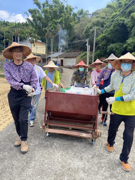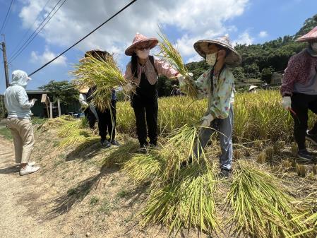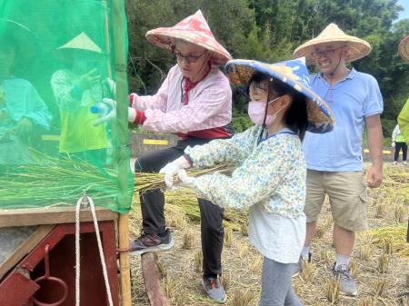 大夥頂著豔陽天,專注地聆聽專業農夫講解稻穗收割技巧,學童們第一次捲褲挽袖下田當農夫,雀躍的心情顯現在每張小臉上,即便彎腰割稻動作不俐落,仍然繼續努力地收割一把把黃澄澄的成熟稻穗。割稻體驗進入尾聲後,港務公司協請農家為學童們準備一頓豐盛的「農家特色收割飯」,感謝老天爺賜予的豐收並體會盤中飧粒粒皆辛苦,人人皆應時刻珍惜平常吃的米飯。