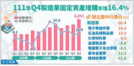 ●111年第4季製造業國內固定資產增購(配合國民所得統計定義不含土地) 6,851億元,季增21.2%,年增16.4%,主因半導體業者持續投資,同步帶動相關供應鏈廠商擴增產能,加上國營事業重大建設持續進行所致。111年全年國內固定資產增購2兆2,713億元,創歷年新高,年增18.1%。