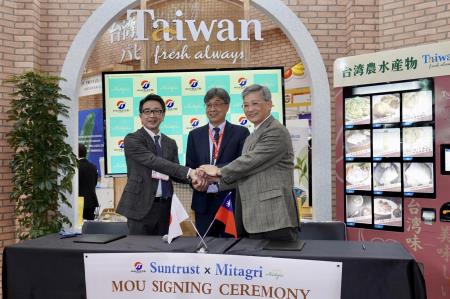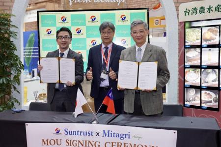 日本Suntrust公司主要從事水產捕撈及真鯛、鰤魚等高品質魚類的養殖,非常重視水產鮮度及品質,是日本極為知名的水產食品公司。至於台農發公司係於105年12月成立,主要是透過國家品牌形象及行銷方式,協助農民、農企業與食品加工廠,將高品質的臺灣農產品行銷全球。該公司肩負開拓新產品與新市場、建構外銷產業鏈等政策任務,最近幾年持續努力開拓香蕉、鳳梨、芒果、荔枝、萵苣、蜜棗、柑橘、柚子、冷凍鳳梨釋迦、冷凍石斑魚等外銷新通路。此次與日本Suntrust公司簽署臺灣水產品採購備忘錄,陳駿季副主委特別對洪董事長與團隊表示肯定與感謝,也要求該公司務必與供貨團體確保品質,爭取更多訂單,逐步擴大在日本市場的外銷規模。