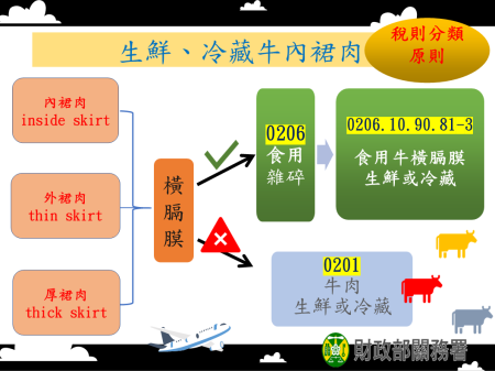財政部關務署表示,「生鮮、冷藏牛內裙肉(inside skirt)」非屬肉品,而係牛的橫膈膜,為一種食用雜碎,應歸屬稅則第0206節「食用雜碎(牛、豬、綿羊、山羊、馬、騾、驢或駃騠),生鮮、冷藏或冷凍」下之貨品分類號列0206.10.90.81-3「食用牛橫膈膜,生鮮或冷藏」,第1欄關稅稅率15%,輸入規定113、B01、F01及MW0,進口時應向農業部動植物防疫檢疫署辦理檢疫及衛生福利部食品藥物管理署辦理輸入查驗,且大陸物品不准輸入。而自美國、加拿大、荷蘭、瑞典、日本或墨西哥進口時,則應向經濟部國際貿易署申請輸入許可證。