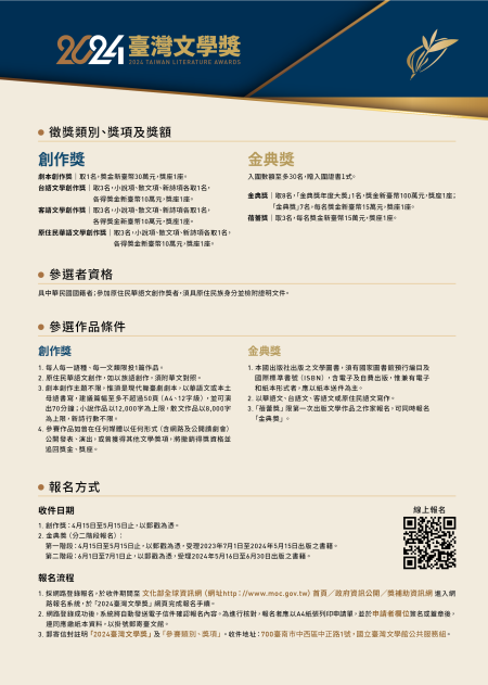 本年度臺灣文學獎將於4月15日開始受理報名。創作獎收件日期為4月15日至5月15日;金典獎則分兩階段收件:4月15日至5月15日受理2023年7月1日至2024年5月15日出版書籍投件;6月1日至7月1日受理2024年5月16日至6月30日出版書籍投件,均以郵戳為憑。