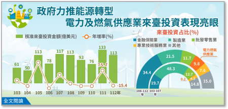 1.核准來臺投資金額近年多超過百億美元:隨企業併購法修正案於105年正式實施,帶動國際私募基金來臺併購增加,在半導體相關產業鏈、風力發電等投資案挹注下,核准來臺投資金額多維持在百億美元以上。觀察近年外人來臺投資情形,109、110年受COVID-19疫情衝擊,影響跨境投資意願,致投資金額分別年減17.9%、18.1%;惟在綠能及離岸風電等大型投資案件帶動下,111年投資金額轉呈年增75.7%,規模值達133億美元,為歷年第3高;112年因景氣趨緩及高基期影響,年減15.4%;累計108年至112年近5年投資528億美元,較上期(103年至107年)增加109億美元或增26.0%,顯示外資持續看好我國投資環境,有助於國內產業升級轉型、創造更多就業機會。