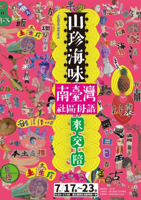 做伙來說母語鬥鬧熱~由文化部所屬國立臺南生活美學館主辦的「山珍海味-南臺灣社區母語來交陪」,活動期間邀請南部七縣市推廣社區母語團體與社區共同展示,並規劃六大主題活動:布袋戲劇場、兒童青少年台語劇場、台語音樂會、台語繪本說故事、藝術手作台語教學活動,過五關集章兌好禮的活動,邀請大朋友小朋友在112年7月17日至7月23日來國立臺南生活美學館看戲、聽故事、DIY手作、台語闖關,一起認識在地、樂學母語。