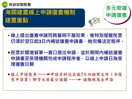 財政部關務署表示,為提供民眾多元申請救濟管道,海關已於關港貿單一窗口建置線上申請復查機制,民眾可先在線上申請復查後,於期限內補送復查申請書至受理機關,則此線上申請日須為機關受理復查日期,不僅可以減少申請復查逾期情形,也能避免時效爭議。