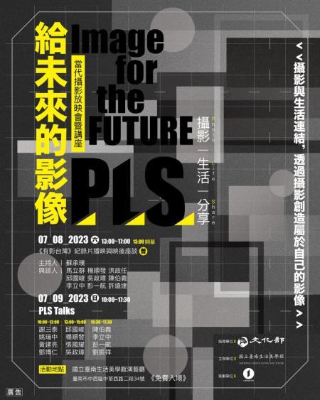 活動次日規劃3場PLS講座(Photo, Life, Share Talks),集結12位不同世代的攝影創作者──謝三泰、姚瑞中、黃建亮、鄧博仁、邱國峻、楊順發、張國耀、吳政璋、陳伯義、李立中、彭一航、劉振祥等人,藉由其生命影像及創作,彼此分享攝影與生活的連結,透過攝影創作屬於自己的影像。