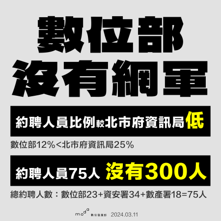 數位發展部11日再次嚴正澄清表示,對於有立委指稱本部約聘300人為網軍云云,皆為錯誤訊息,數位部沒有網軍,也沒有300位的約聘人員。行政院人事行政總處核給數位部113年總預算員額人數598人,一部兩署約聘員額為75人,約占預算員額12%,約聘比例低於臺北市政府資訊局的25%。本部對此事已經多次說明澄清,請勿再用錯誤訊息誤導社會大眾。